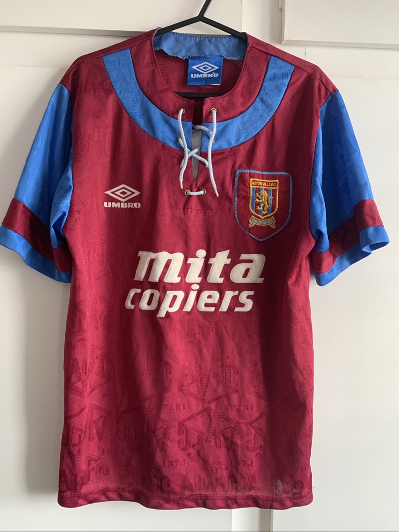 Worn by the likes of Ray Houghton, Steve Staunton and Dwight Yorke this Aston Villa is so brilliantly of its time that it seems impossible anyone was able to run around in a shirt like this at all. The whole composition of it looks as though it was sewn together by a grandmother but you could wear this down the pub on a winters afternoon and you'd be as good as gold. Our team reckon this is in the £140 range.