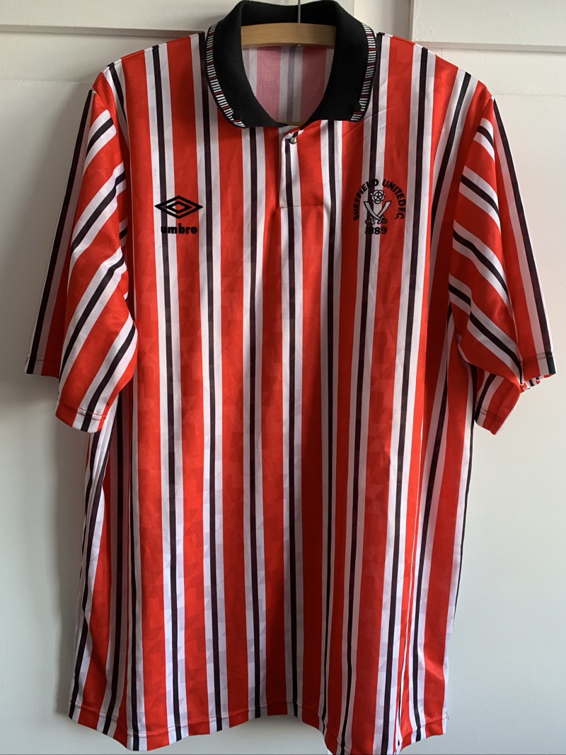 A wonderfully retro from one of Sheffield Utd's best seasons in the top flight, especially in relatively recent terms. Fresh on the back of promotion under Dave Bassett the team secured a 13th place finish with the likes of Briane Deane and Paul Stancliffe starring. The contest of the club's iconic clubs and that crisp collar make this a Sheffield United classic and one we'd value in the range of £150.