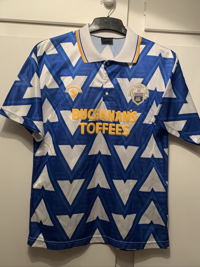 We are suckers for everything that Matchwinner made in the 90s and this is no different. Greenock Morton's shirts from the late 80s and early 90s are up there with any clubs. This eye-catching shirt is set off by the yellow trim on the collar and the brilliantly simple sponsor - Buchanan's Toffee. A retro classic that we value at £215.